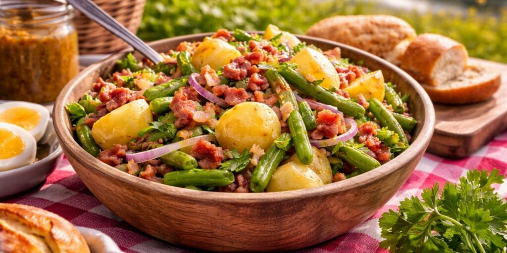 La salade liégeoise est un plat complet originaire de la région de Liège. Elle se compose généralement de pommes de terre, de haricots verts et de lardons. Servie chaude à l’origine, elle peut tout à fait être dégustée froide. Cela en fait une excellente option pour un pique-nique. Elle est nourrissante et savoureuse.